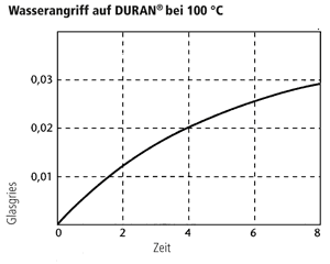 1. Nach DIN ISO 719 ist DURAN® der höchsten Wasserbeständigkeitsklasse 1 (von fünf Klassen) zugeordnet. Es wird die Menge Na2O/g Glasgries gemessen, die sich nach einer Stunde in Wasser bei 98 °C herauslöst. Bei DURAN® beträgt diese Menge weniger als 3 μg/g Glasgries.