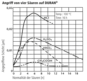 2. Nach DIN ISO 1776 wird die angegriffene Schichtdicke des Glases in Abhängigkeit von der Art der Säure und ihrer Konzentration geprüft. Die Ergebnisse für vier Säuren sind in nebenstehender Grafik dargestellt. Der größte Angriff findet bei Säuren mit einer Konzentration von 4–7 n statt. Bei höheren Konzentrationen nimmt die Reaktionsgeschwindigkeit deutlich ab, so dass die angegriffenen Schichtdicken auch nach Jahren nur im Bereich einiger μm liegen. Bei den typischen Wanddicken der Laborglasgeräte spielt dieser Säureangriff keine nennenswerte Rolle.