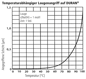 DURAN® entspricht der Klasse 2 der nach DIN ISO 695 in drei Laugenklassen eingeteilten Gläser. Der Oberflächenabtrag nach dreistündigem Kochen in einer Mischung aus gleichen Volumenanteilen Natriumhydroxidlösung (Konzentration 1 mol/l) und Natriumcarbonatlösung (Konzentration 0,5 mol/l) beträgt nur ca. 134 mg/100 cm². Der Laugenabtrag verhält sich direkt proportional zur Zeit. Er setzt jedoch erst bei Temperaturen über 60 °C spürbar ein. Bei niedrigeren Temperaturen ist auch über Jahre hinweg die Wanddicken-