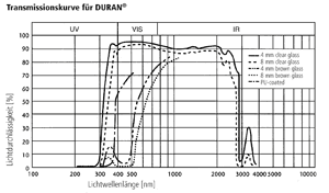 DURAN® ist klar und farblos. Im Spektralbereich zwischen 310 und 2.200 nm ist die Absorption von DURAN® vernachlässigbar gering. Größere Schichtdicken (axiale Durchsicht bei Rohren) erscheinen leicht gelb/grünlich. Für lichtempfindliche Substanzen werden DURAN®-Oberflächen mit brauner Diffusionsfarbe eingefärbt. Dabei ergibt sich eine hohe Absorption kurzwelligen Lichts. Die Absorptionskante liegt bei ca. 500 nm. Bei fotochemischen Verfahren ist die Lichtdurchlässigkeit von DURAN® im ultravioletten Bereich von besonderer Bedeutung. Am Transmissionsgrad im UV-Bereich ist erkennbar, dass sich fotochemische Reaktionen durchführen lassen, z.B. Chlorierungen und Sulfochlorierungen. Das Chlormolekül absorbiert im Bereich von 280 bis 400 nm und dient somit als Überträger der Strahlungsenergie.