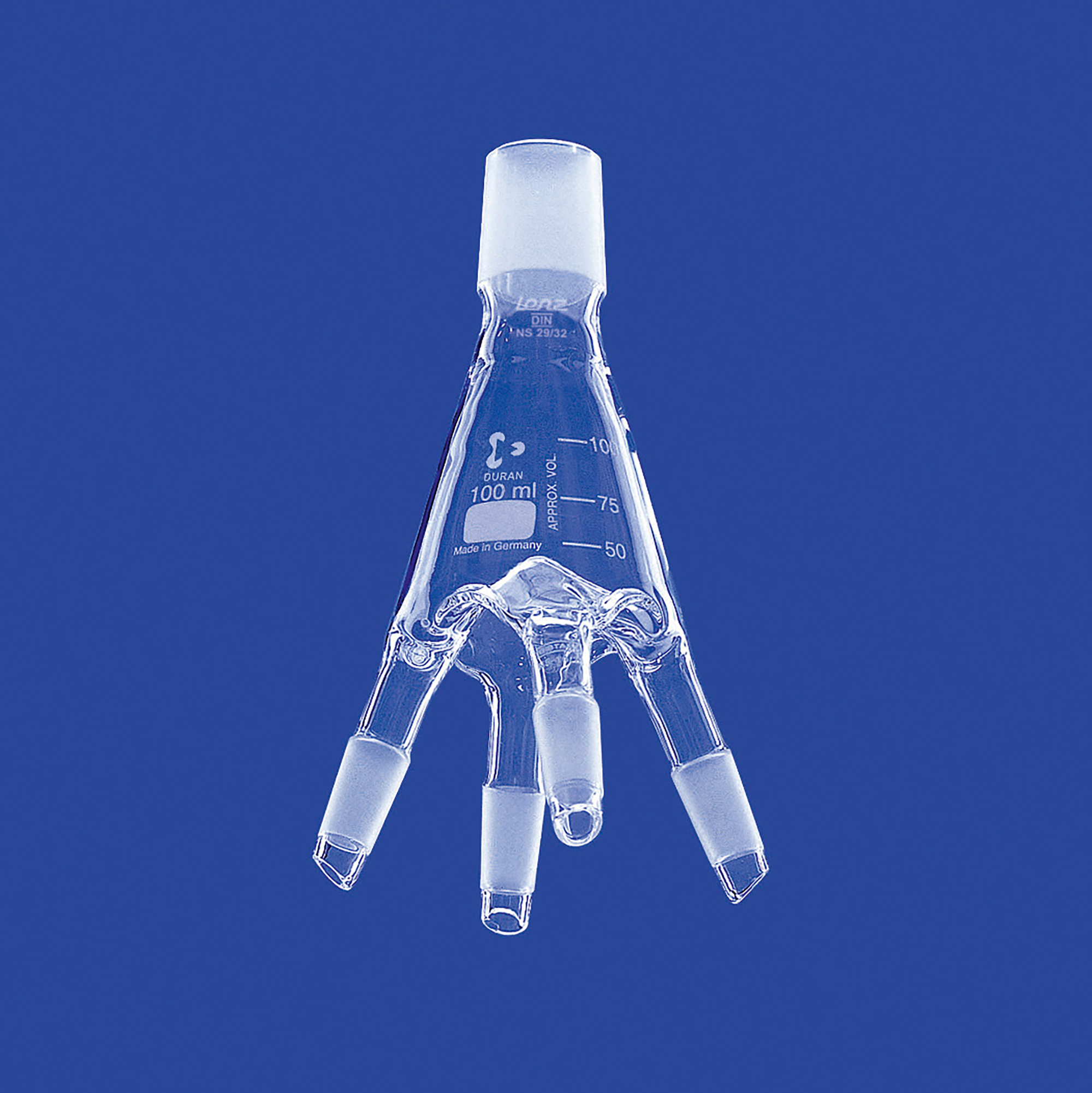 Destillatverteiler mit vier Kernen NS 14/23, für Rundkolben bis max. 250 ml Inhalt, hergestellt aus DURAN®-Rohr