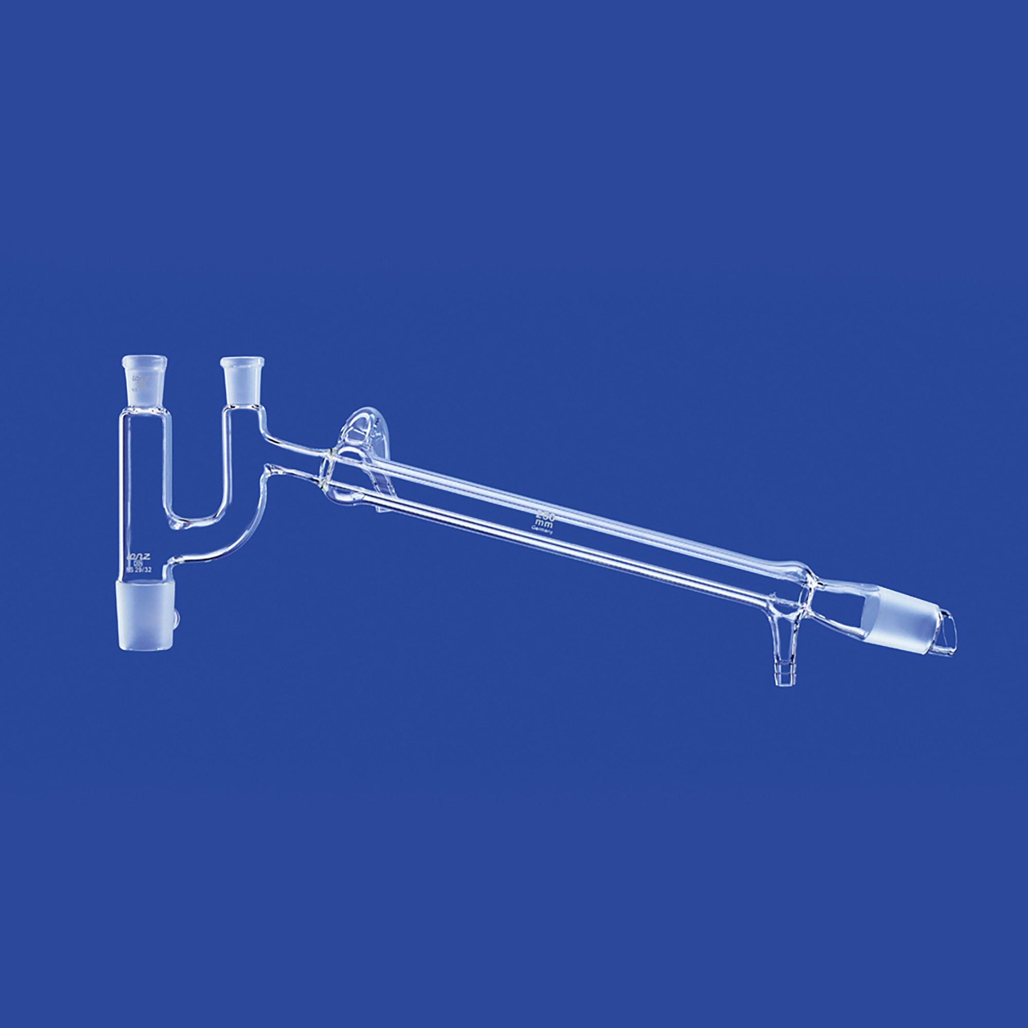 Destillierbrücken mit Liebig-Kühler (gerader Abgang) und Aufsatz nach Claisen, Kühlwasseranschluss mit Olive, mit zwei Schliffhülsen NS 14/23 für Destillationsthermometer mit einer Einbaulänge von 55 mm, hergestellt aus DURAN®-Rohr