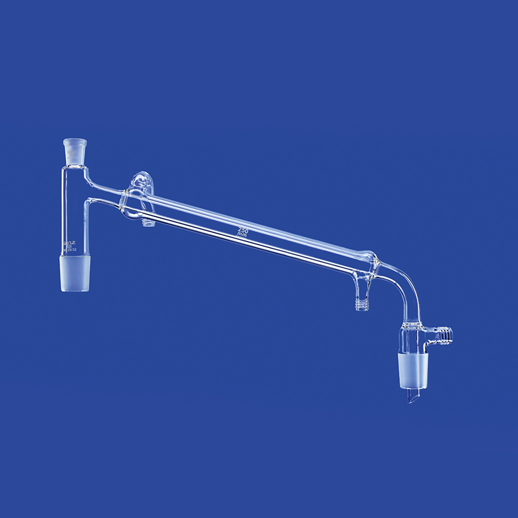 Destillierbrücken mit Liebig-Kühler, Ablaufrohr mit NS-Kern, Gewindeanschlüsse: GL 14 (Kühlwasser), GL 18 (Vakuum), mit Schliffhülse NS 14/23 für Destillationsthermometer mit Einbaulänge 55 mm,