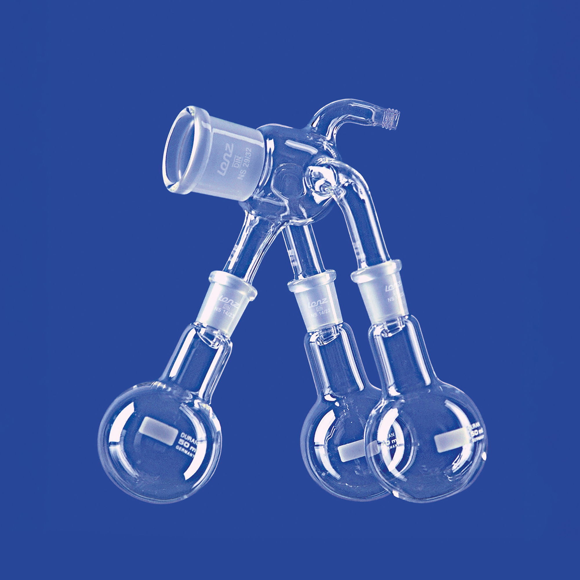 Destilliervorlagen nach Bernauer (modifiziert), mit drei Kernen NS 14/23 und drei Kolben, Absaugstutzen mit Olive, hergestellt aus DURAN®-Rohr