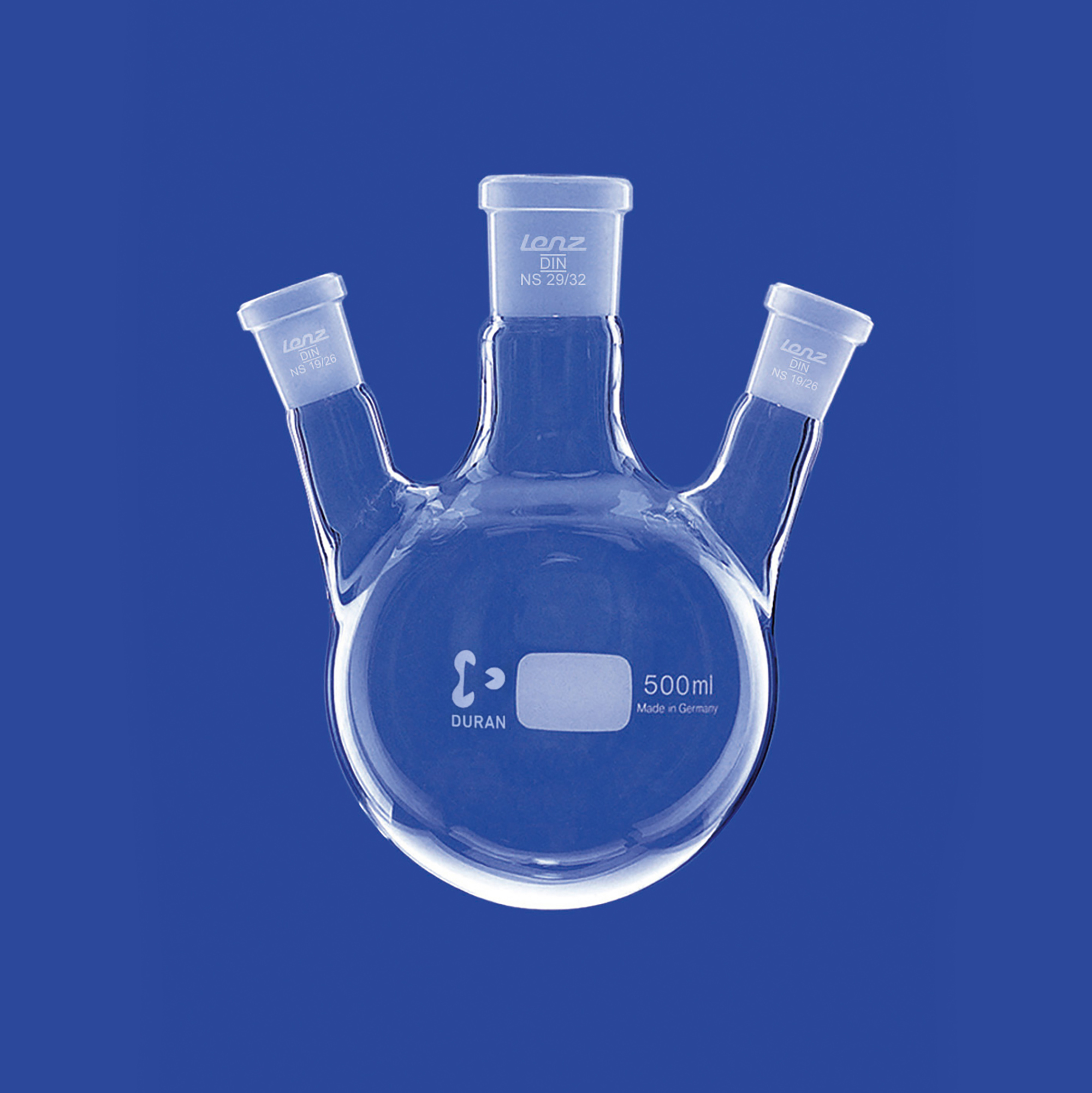 Destillationskolben nach DIN 12394 und in Ergänzung zur DIN-Norm, mit zwei schrägen Seitenhälsen (Winkel: 20°), mit Normschliff, mit Beschriftungsfeld, Material: DURAN®