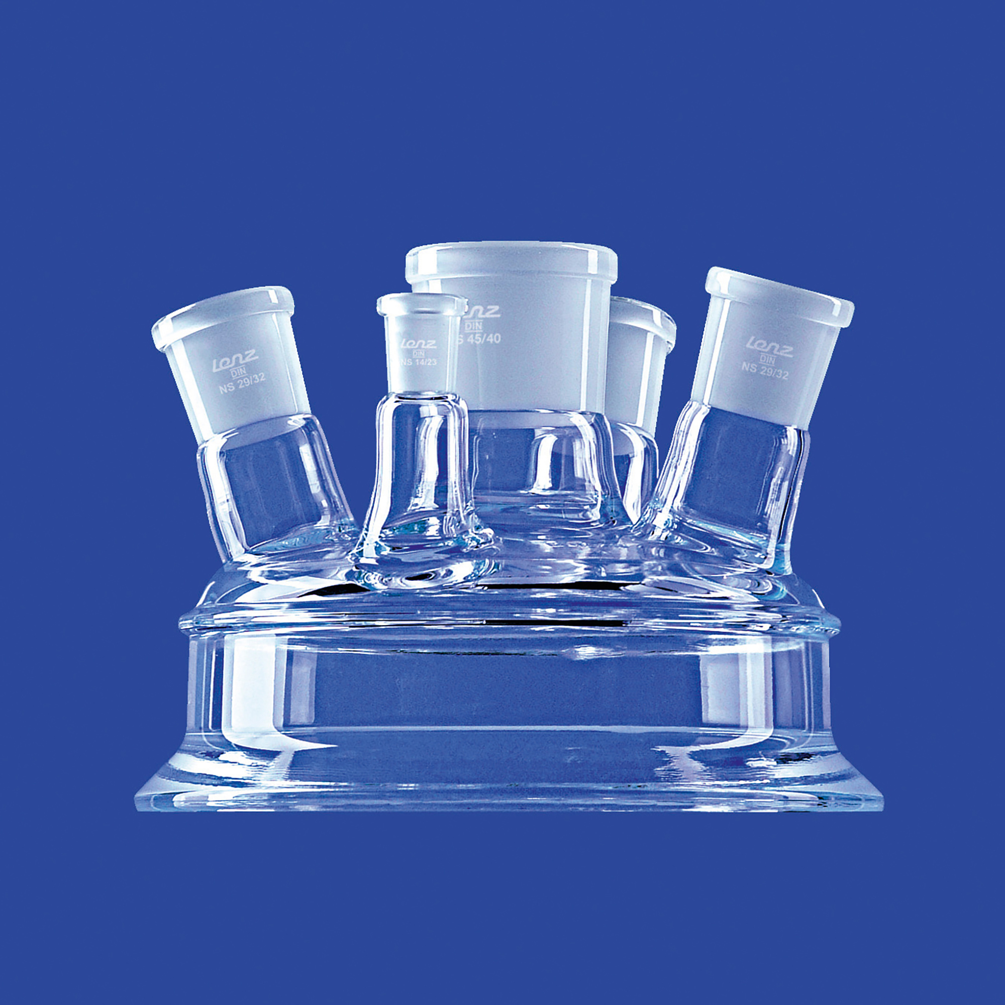 Planschliff-Deckel, Mittelhals, drei schräge Seitenhälse, ein gerader Seitenhals