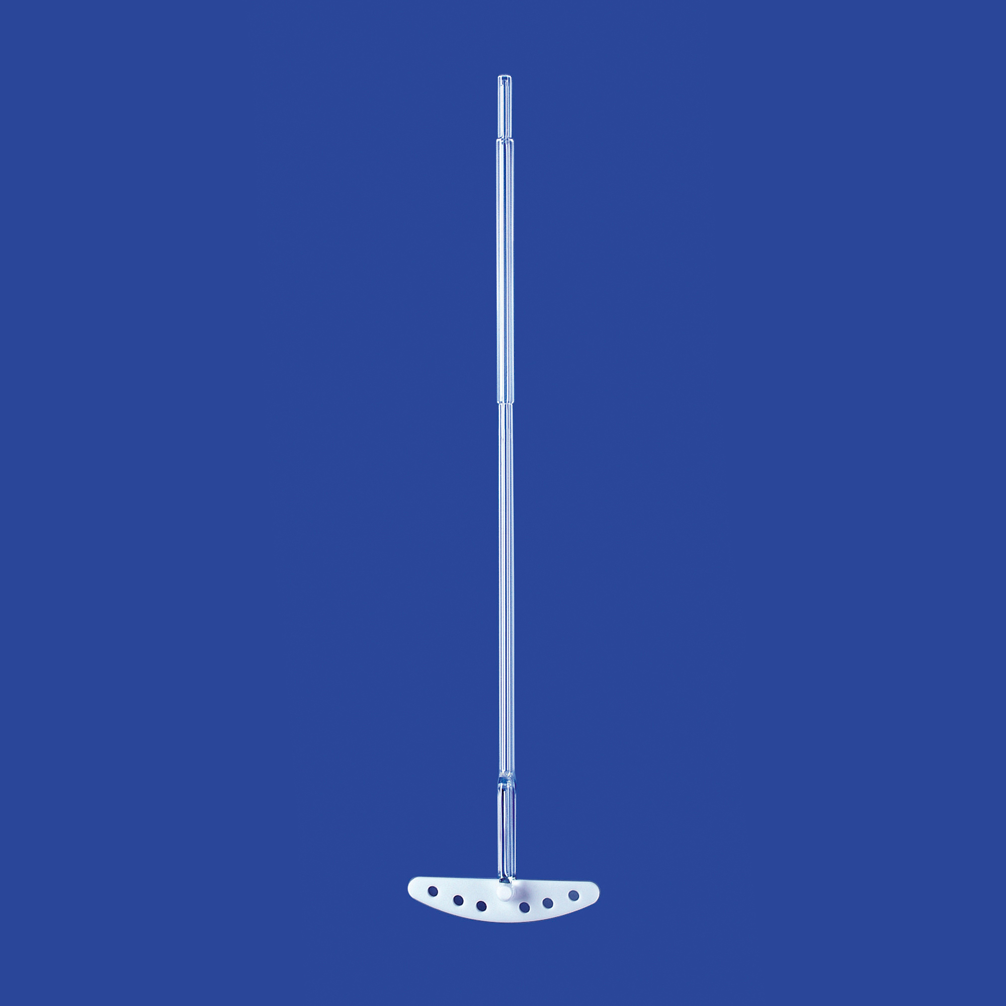 Aus kalibriertem Präzisionsglas, geschliffene und polierte Lauffläche, Wellen‑Ø: 10 mm, Kupplungszapfen: Ø 8 x L 40 mm, mit Druckknopf zum Auswechseln der PTFE-Rührblätter, Rührblatt: PTFE (gelocht), Rührwelle hergestellt aus DURAN®-Rohr