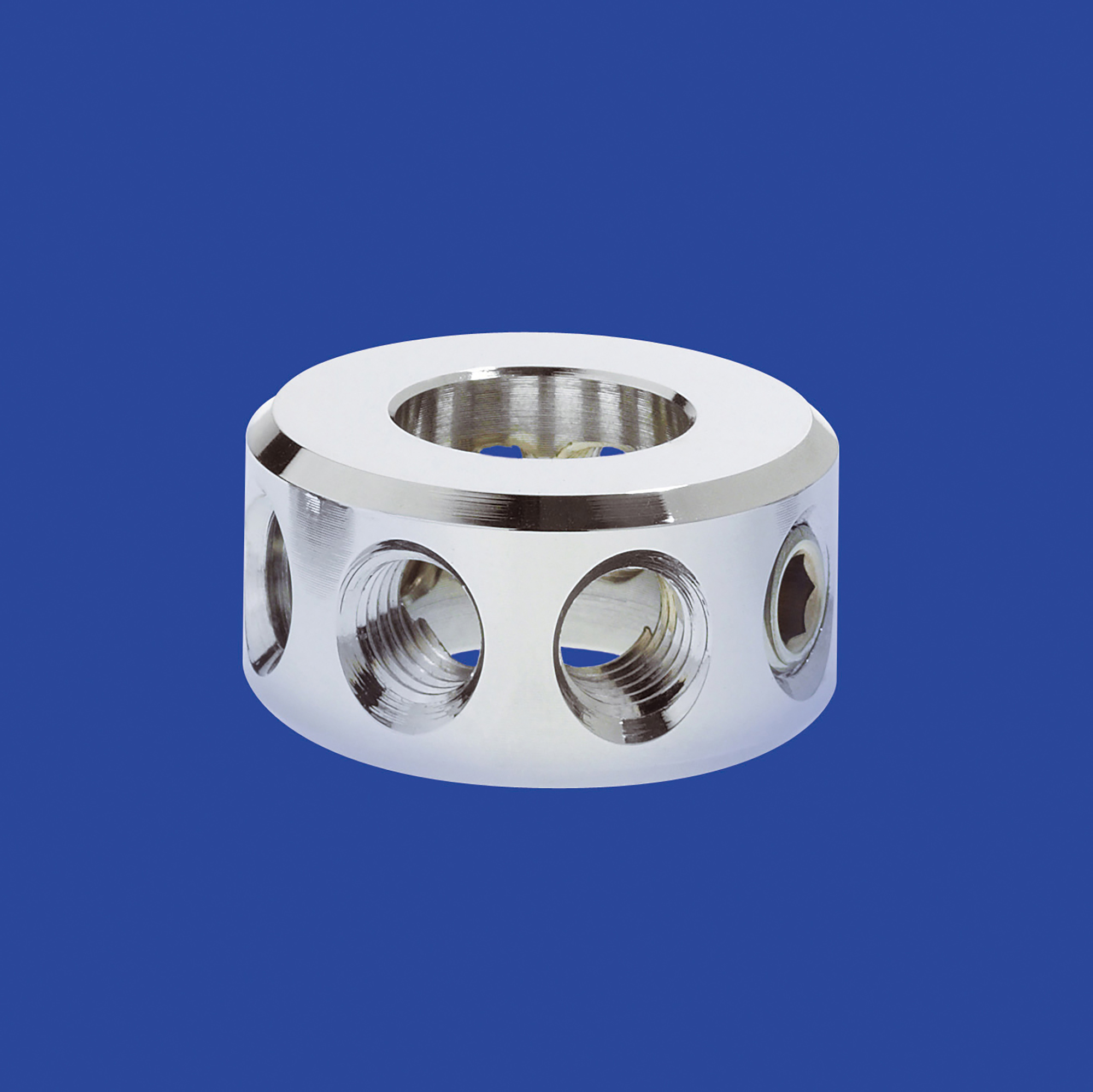 Zentrale Bohrung für Stabdurchmesser 22 mm, höhenverstellbar, mit 8 Gewindebohrungen M 12, komplett mit Gewindestift M12 Material: Stahl, verchromt, VPE: 1 Stück Art.-Nr.: 6 2476 18