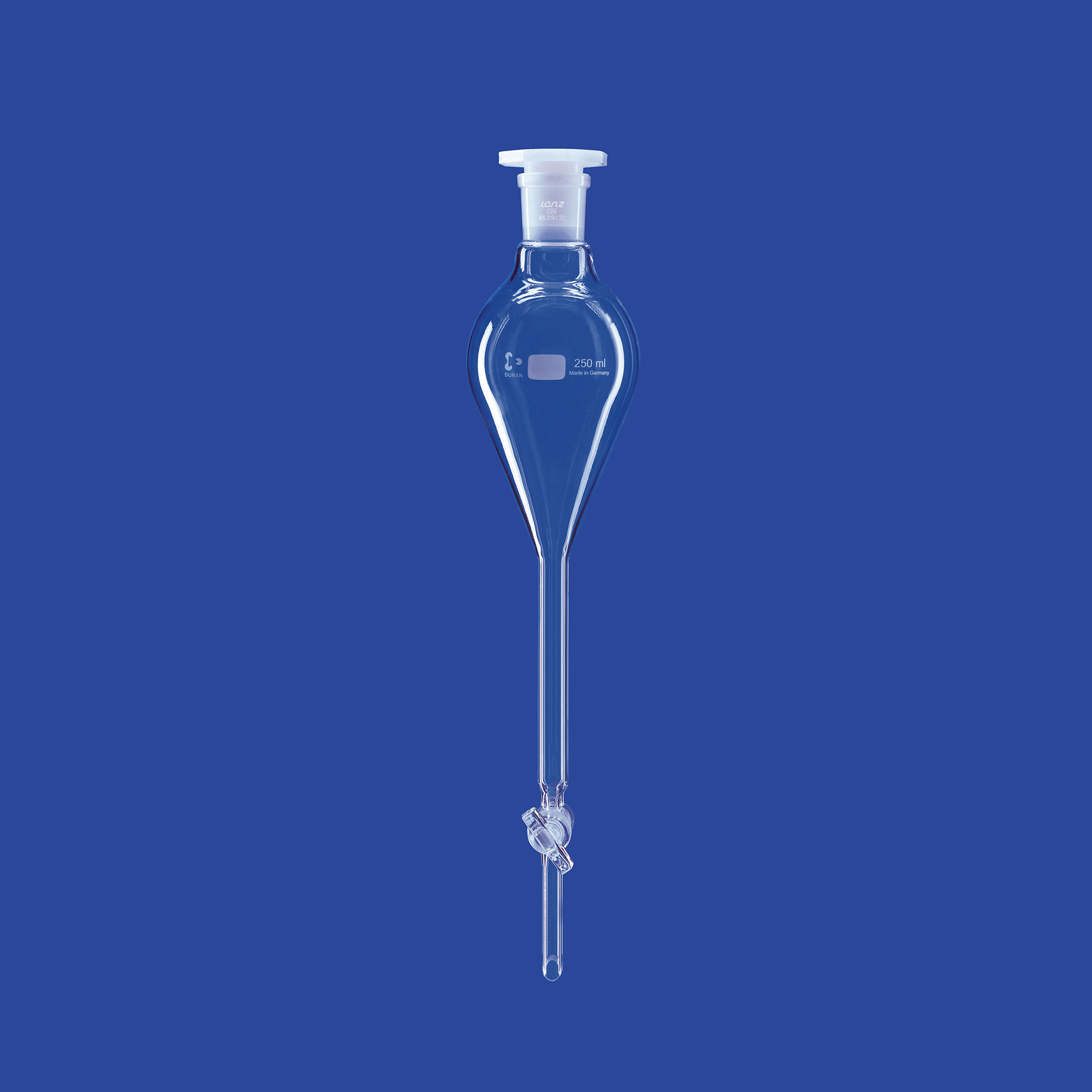 Mit NS-Hülse und Kunststoff-Stopfen (PE), ohne Teilung, mit massivem NS-Glasküken, mit Gewindehahnsicherung, mit Beschriftungsfeld, Material: Borosilikatglas 3.3