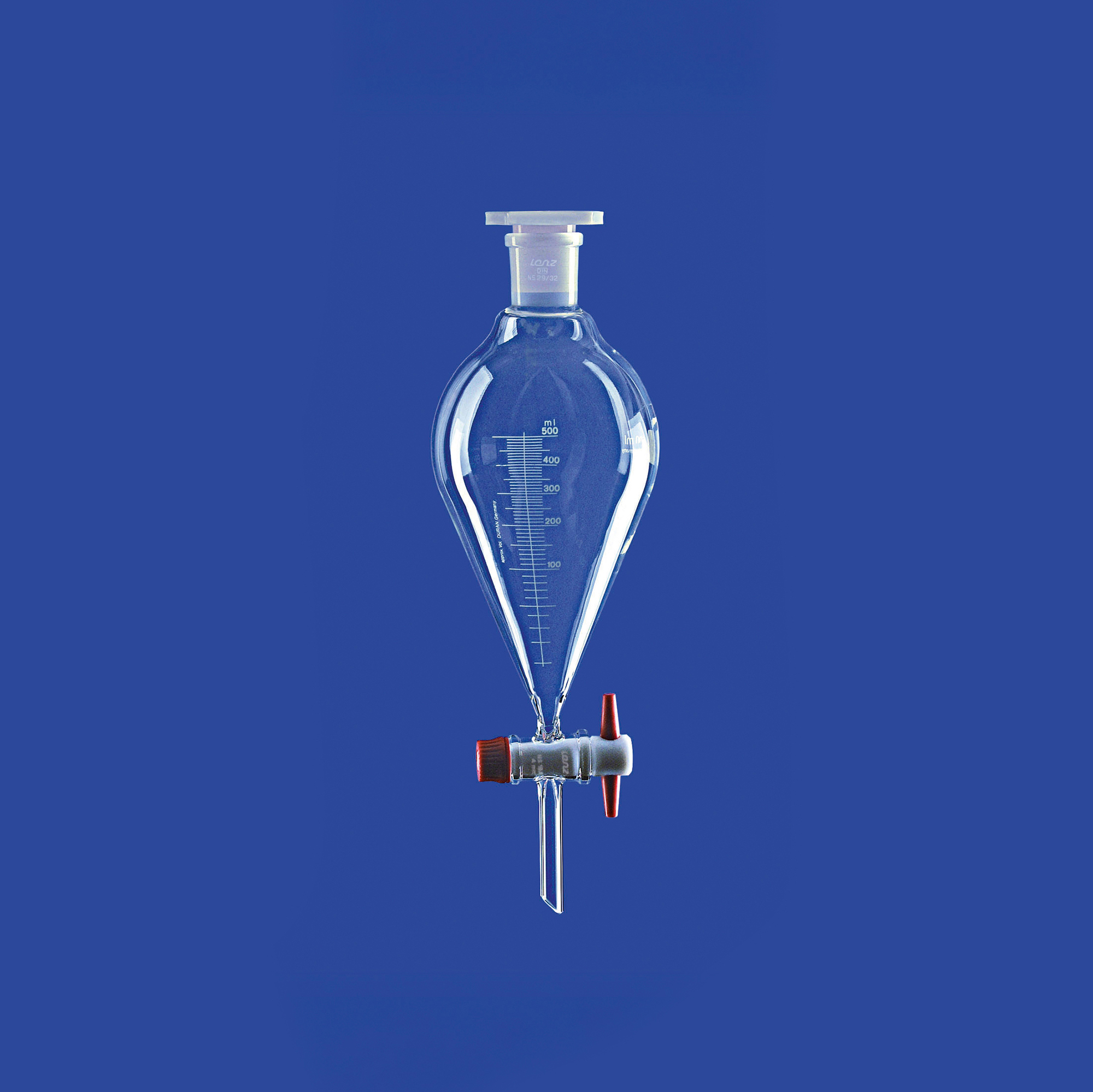 Mit NS-Hülse und Kunststoff-Stopfen (PE), mit Teilung zum Ablesen des Zirka-Volumens, mit PTFE-Küken, mit Gewindehahnsicherung, Material: Borosilikatglas 3.3