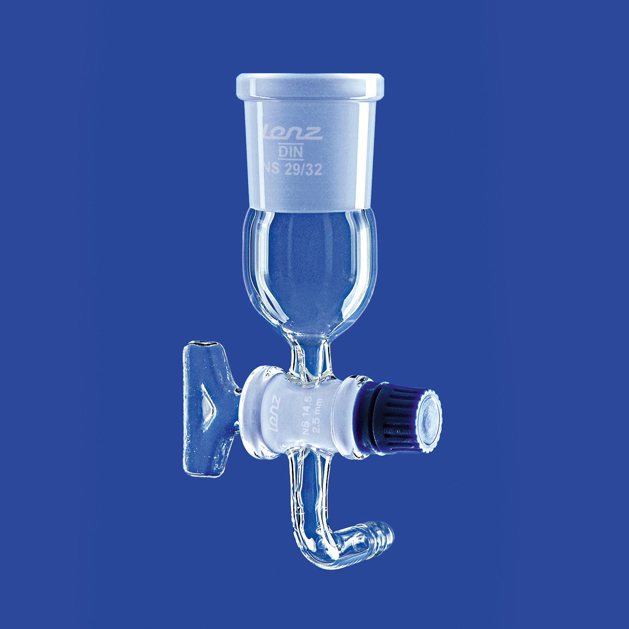 Übergangsstücke mit NS-Hülse, gebogener Schlaucholive (90°) und NS-Hahn mit massivem Glasküken, Bohrung: 2,5 mm, hergestellt aus DURAN®-Rohr