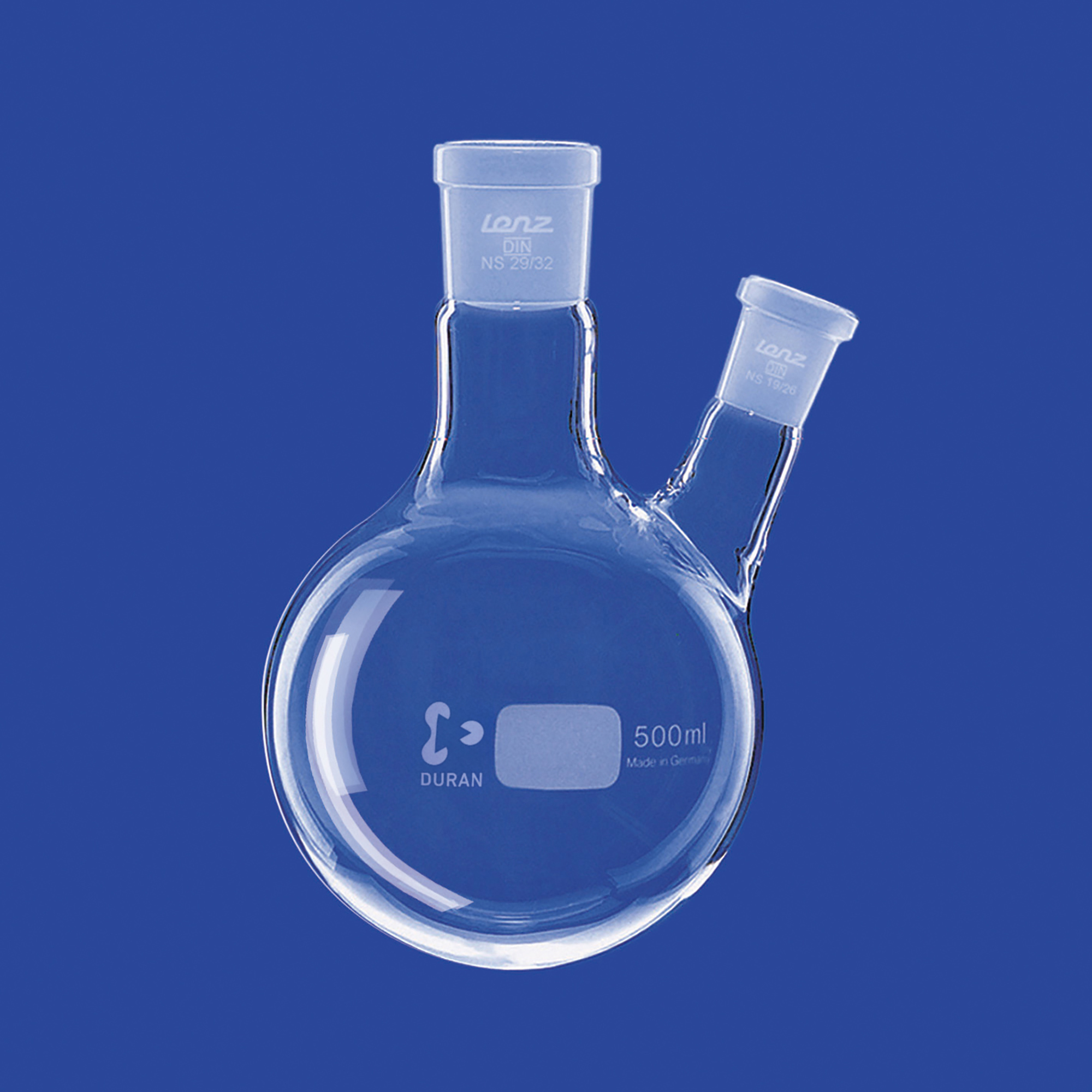 Destillationskolben nach DIN 12394 und in Ergänzung zur DIN-Norm, mit NS, mit schrägem Seitenhals (Winkel: 20°), mit Beschriftungsfeld, Material: DURAN®
